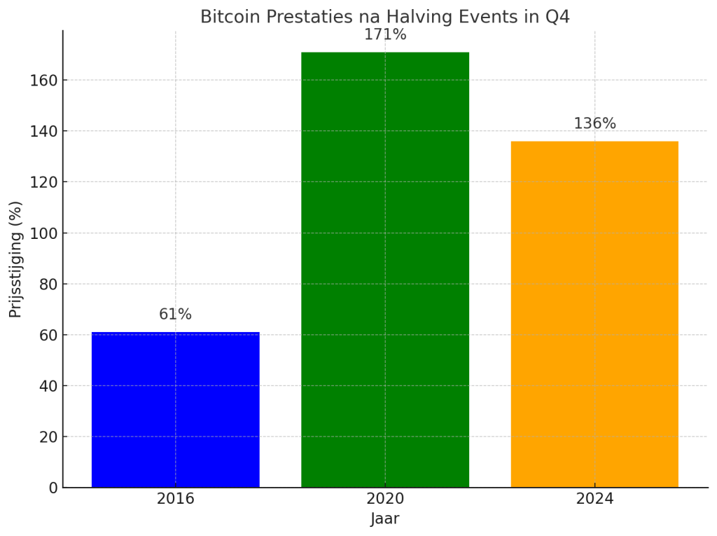 De bekende crypto-analist Ali Martinez wijst op de prestaties van Bitcoin tijdens eerdere halving-events. In 2016 steeg Bitcoin met 61% in het vierde kwartaal, en in 2020 was er zelfs een stijging van 171%. Als Bitcoin deze prestatie in 2024 weet te herhalen, kan de koers tegen het einde van het jaar uitkomen tussen $100.000 en $172.000.