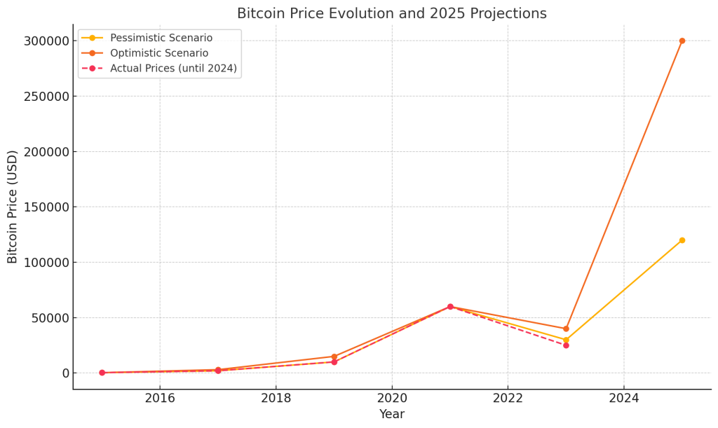 Op basis van eerdere cycli en de huidige marktdynamiek, zou een realistische schatting voor de Bitcoin-prijs in 2025 liggen tussen $120.000 en $300.000. Deze schatting is gebaseerd op historische trends van prijsstijgingen na halveringen, toegenomen vraag door institutionele adoptie, en een groeiend vertrouwen in Bitcoin als waardeopslag.